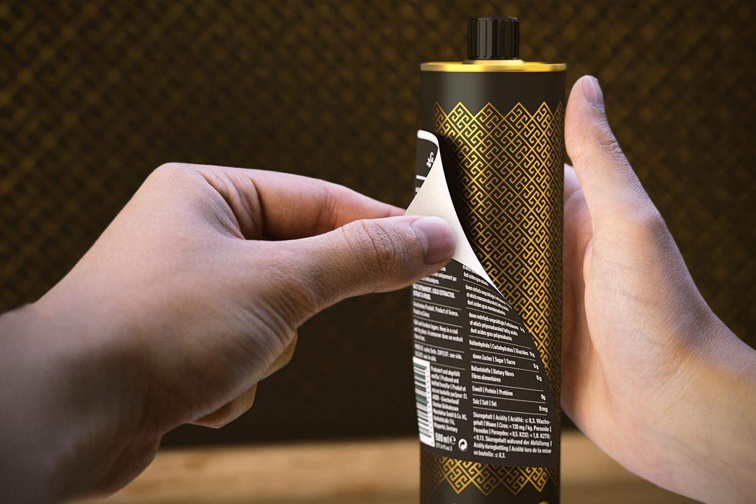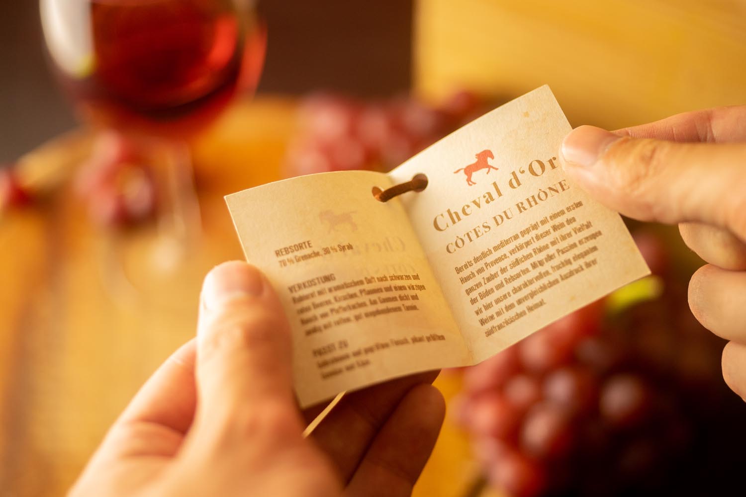 Region im Stil einer alten Karte. Es fällt durch seine unkonventionelle Form besonders im Regal auf, wirkt aber trotzdem edel und gehoben. Um dem Etikett etwas Charm zu verleihen, wurde alles in einem alten Kartenstil gestaltet. Zusätzliche Informationen sowie Deklaration finden auf dem kleinen Infozettel platz. Durch das entfallene Rückseitenetikett und die individuelle Form des Vorderseitenetiketts kommt die Flaschenform besonders gut zur Geltung und trägt zum schönen Gesamtbild bei.